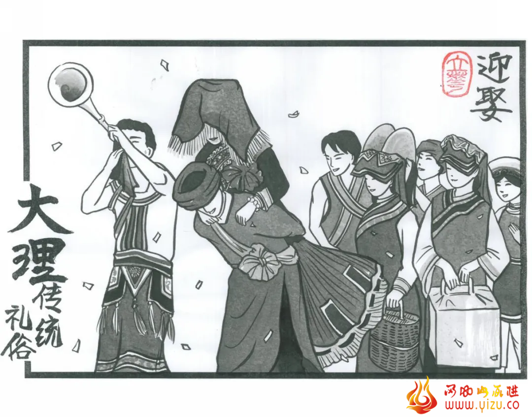 家里孩子成年婚嫁时,首先要择吉日良辰,结婚当天,除了亲友,寨子的人都会来帮忙杀鸡、宰猪,在院内搭“喜篷”, 彝族人叫“相帮”。如果男方家来接新娘,就要带上18公斤肉,8公斤酒,一个春盒,内装羊脖子一截,熟鸡一只,苦荞面一团,还有16元8角,叫“喂奶钱”(现在这个礼金因新郎的经济实力而不等,不再是16元8角)。新郎由朋友(伴郎)做伴,有的还要选4对或6对青壮年夫妇随同,加上请来的旗手、锣手、吹鼓手、抬嫁妆等若干人,前往女方家迎娶。到了门口新郎由新娘的亲哥或胞弟迎接进门,到堂前,先递给新郎苦茶喝,后递甜茶(先苦后甜之意),最后传酒(长久之意), 新郎将春盒交母舅,喂奶钱交岳母,接着女方家宴请新郎和随行的人。文/李海情(大理州彝族学会副会长、秘书长) 图/陈立华(旅居画家) |