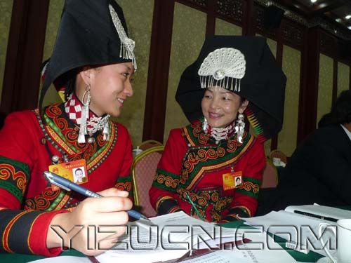 全国人大代表、四川省凉山彝族自治州歌舞团演员张蓓蓓(左),全国人大代表、九三学社四川省凉山州西昌市 ...