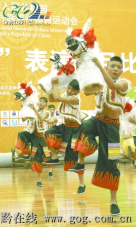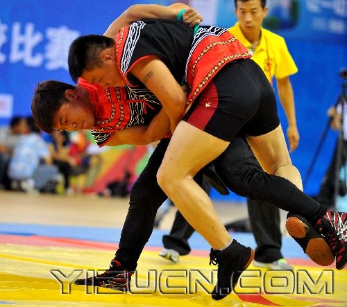 贵阳,2011年9月11日 (民族运动会·项目介绍)(1)民族式摔跤——格 9月11日,贵州选手阿木萨那( ...